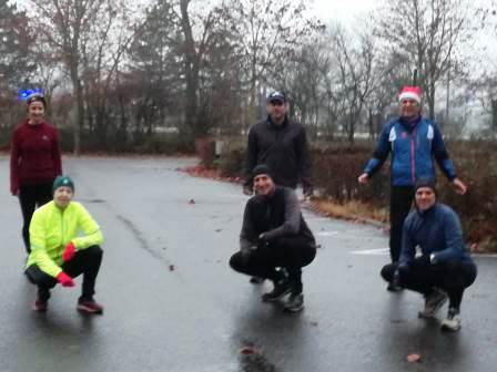 Abbildung: Lauftrainer Jürgen (Nikolausmütze), Lauftrainerin Monika (lila Mütze) mit Laufteilnehmer*innen